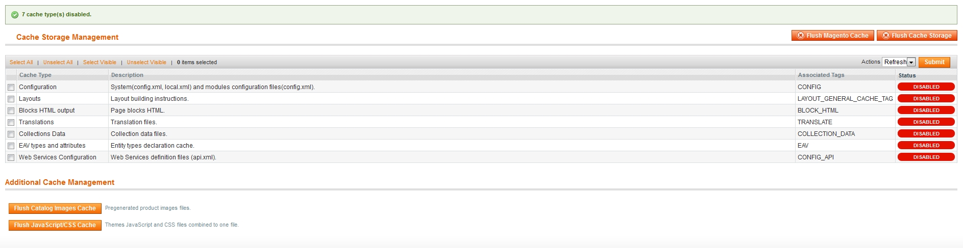 - kies achter ‘action’ voor ‘disable’ en klik op ‘submit’ om de Magento cache uit te schakelen